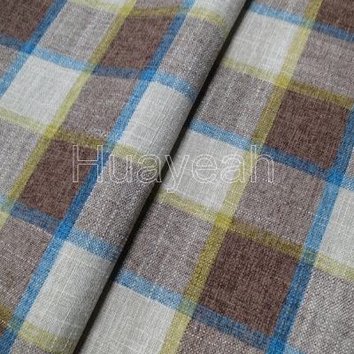 blue checked pattern linen look polyester fabric